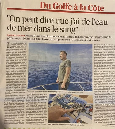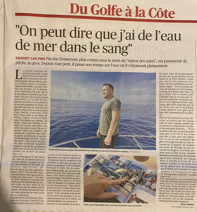 "Le Minot des Mers" est un professionnel qualifié de 32 ans, passionné depuis sa naissance, il a grandi au milieu des plus grands spécimens, des plus grands concours de pêche au gros, des plus belles calanques de la Côte Bleue et des pierres où se cachent plusieurs espèces de poissons permettant de ressentir de bonnes sensations au bout de la canne. Doté de toutes les compétences nécessaires pour vous faire vivre des aventures maritimes uniques, il possède les diplômes de capitaine 200 et de mécanicien 750, lui permettant de naviguer en toute sécurité et de gérer les aspects techniques des navires.